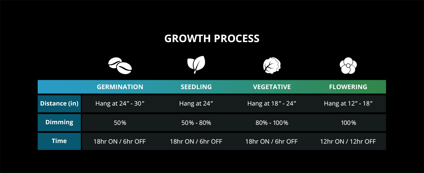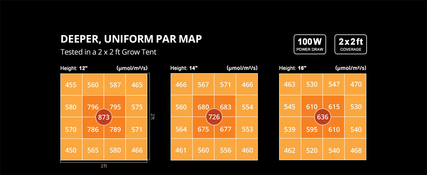 【Coverage Area】Perfect for 2.5x2.5 ft vegetative coverage at 16” and 2x2 ft flowering coverage at 12”.