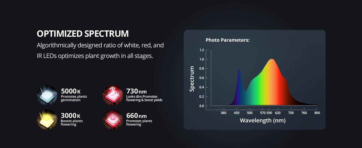 【OPTIMAL FULL SPECTRUM LIGHT】Consists of 660nm red light, 3000K 5000K white light, and 730nm far red IR spectrum, provides plants in all stages from veg to flower with everything they need in the natural sunlight.